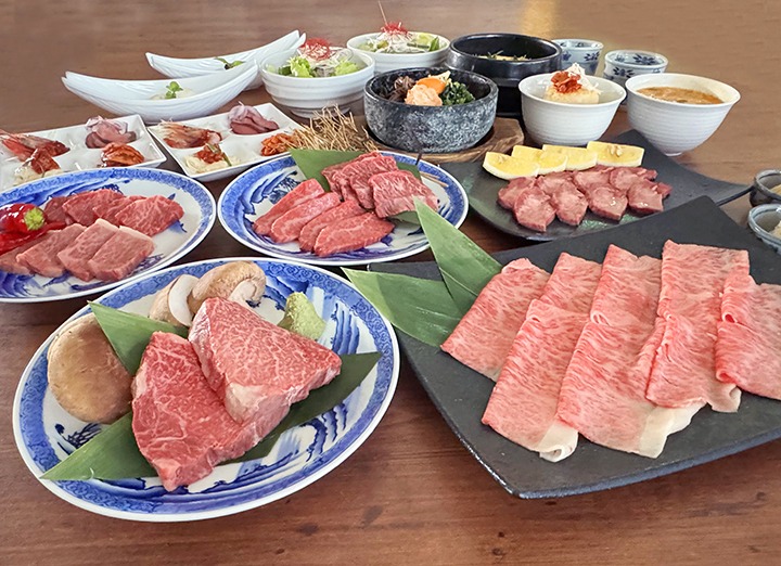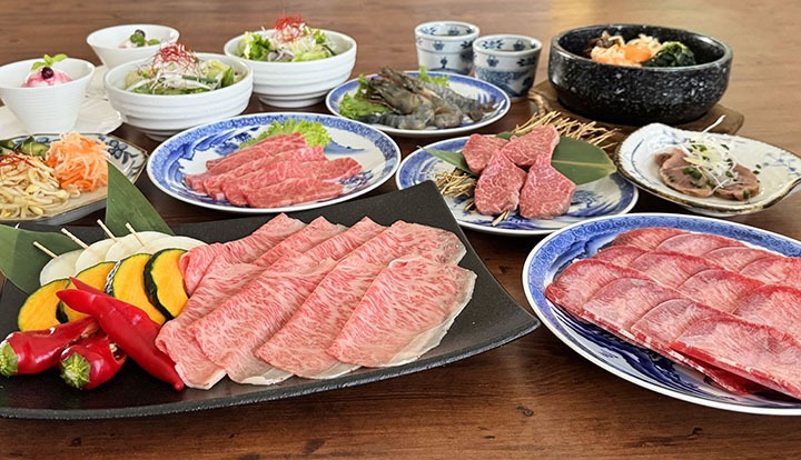 和牛ローストビーフ、特上 生タン塩、厚切り和牛ランプステーキ、厳選和牛塩焼き2種、旬の焼き野菜、口直し、チョレギサラダ、厳選和牛 タレ焼き、極上霜降りロースの焼きすき、自家製キムチ、季節野菜のナムル、選べるお食事、デザート