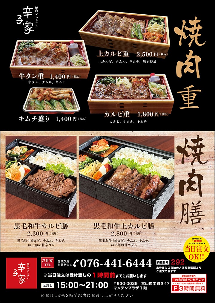 2026.02.26 辛子家 メニュートピックス テイクアウト弁当(焼肉膳、焼肉重) 注文はお渡し日当日でもOK!お渡しの1時間前までにお願いします。電話注文がおすすめです。商品のお渡しは16:00~20:00まで。 前の記事へ 一覧へ戻る