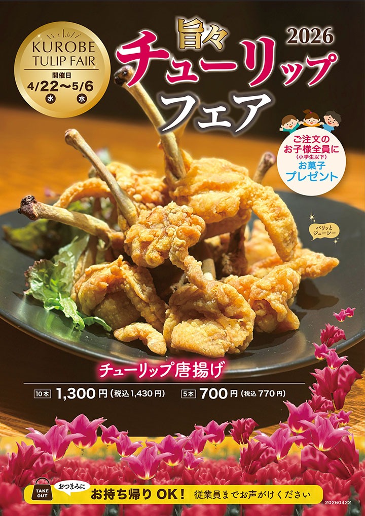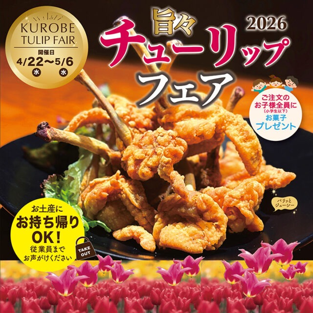 2026.04.20 くろべ メニュートピックス くろべチューリップフェア 2026年 2026年4月22日〜5月6日まで開催! ※テイクアウトも承り中です。前日までにご予約ください 前の記事へ 一覧へ戻る