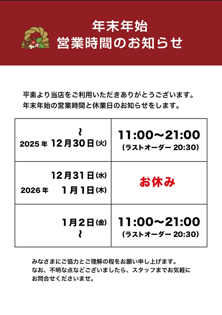 11:00〜21:00 (L.O.20:30)